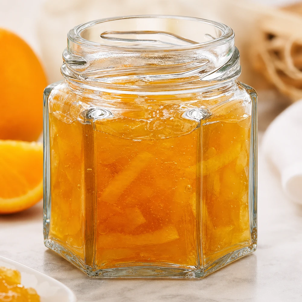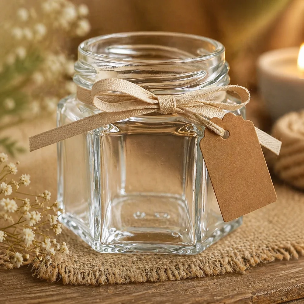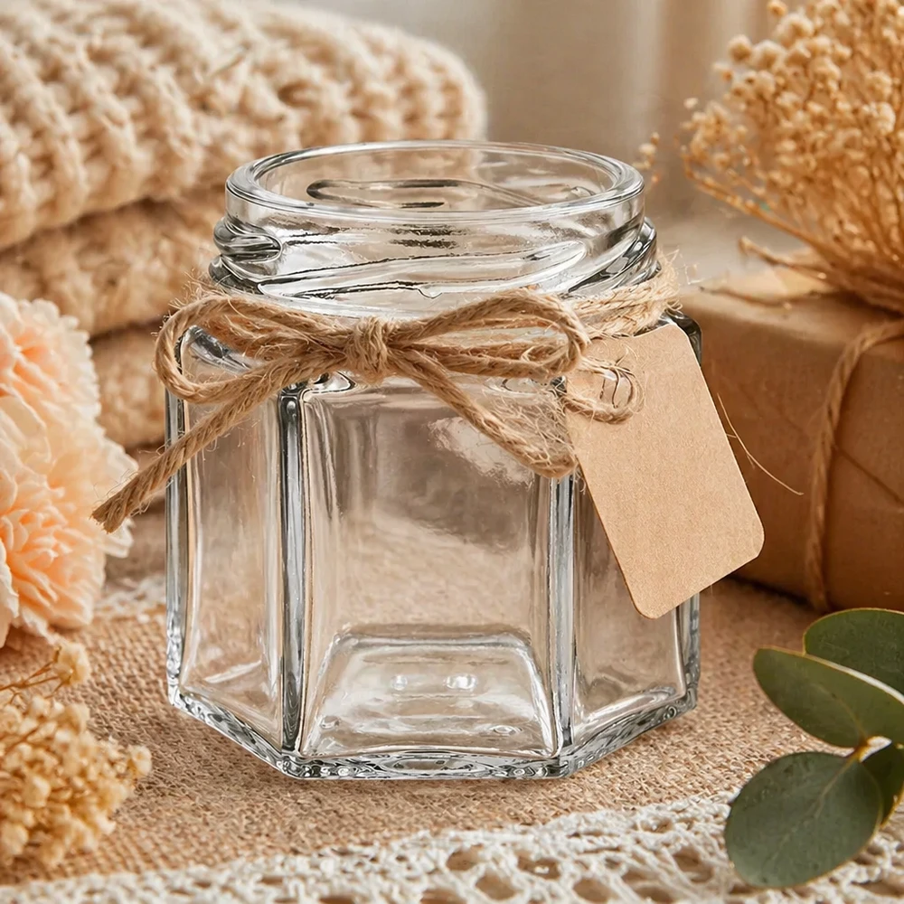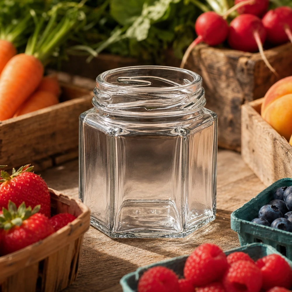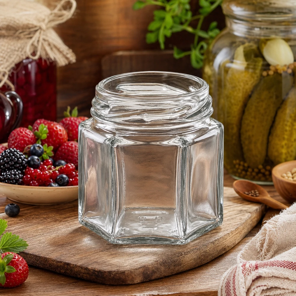 Andere Bezeichnungen: 6-Eckglas, sechseckiges Glas, Glas, Twist-Off Glas, Marmeladenglas, Honigglas, Verpackungsglas, Einmachglas