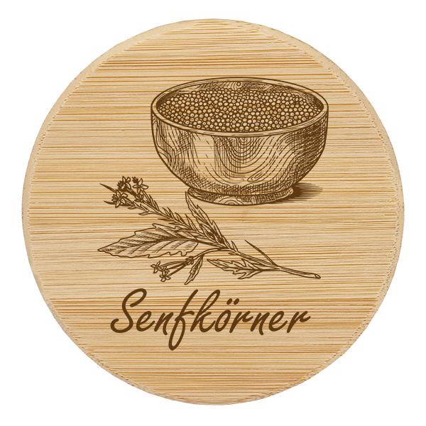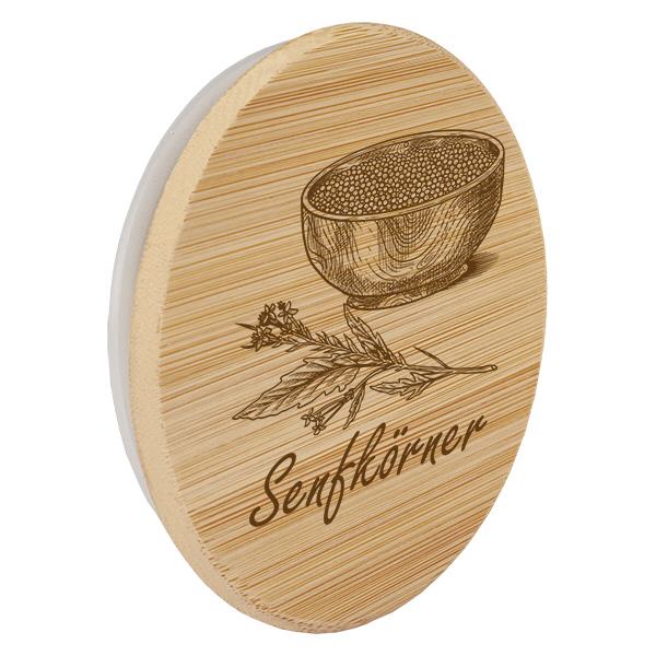 - Aufdruck: Brauner Schriftzug und Bild "Senfkörner"